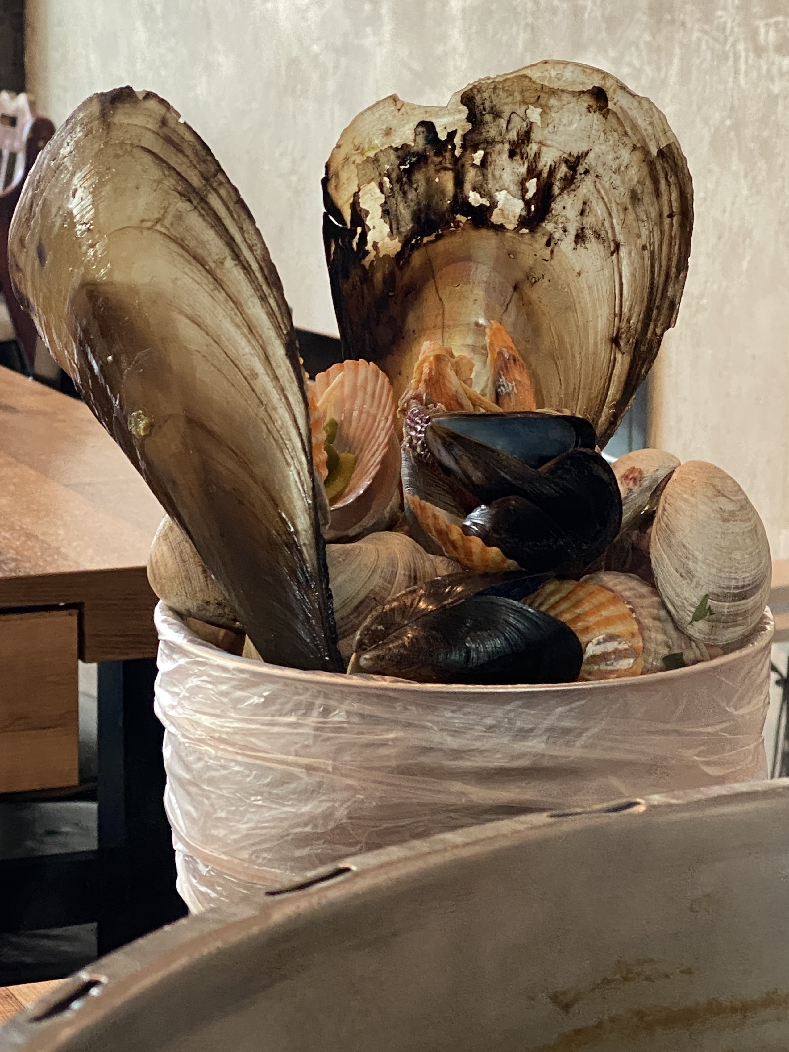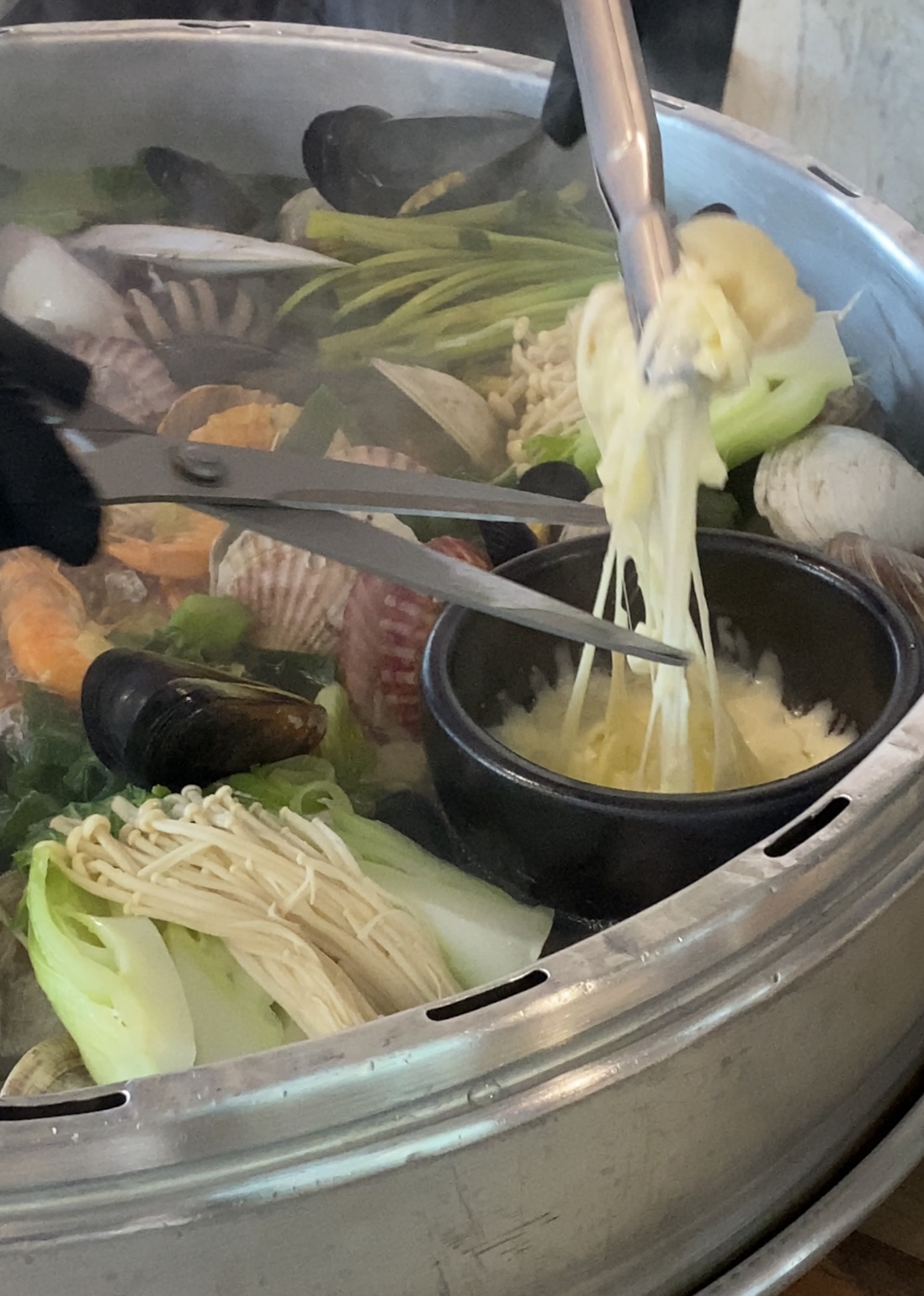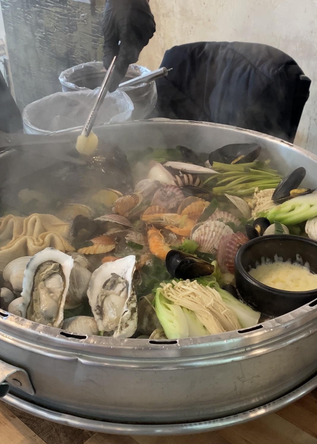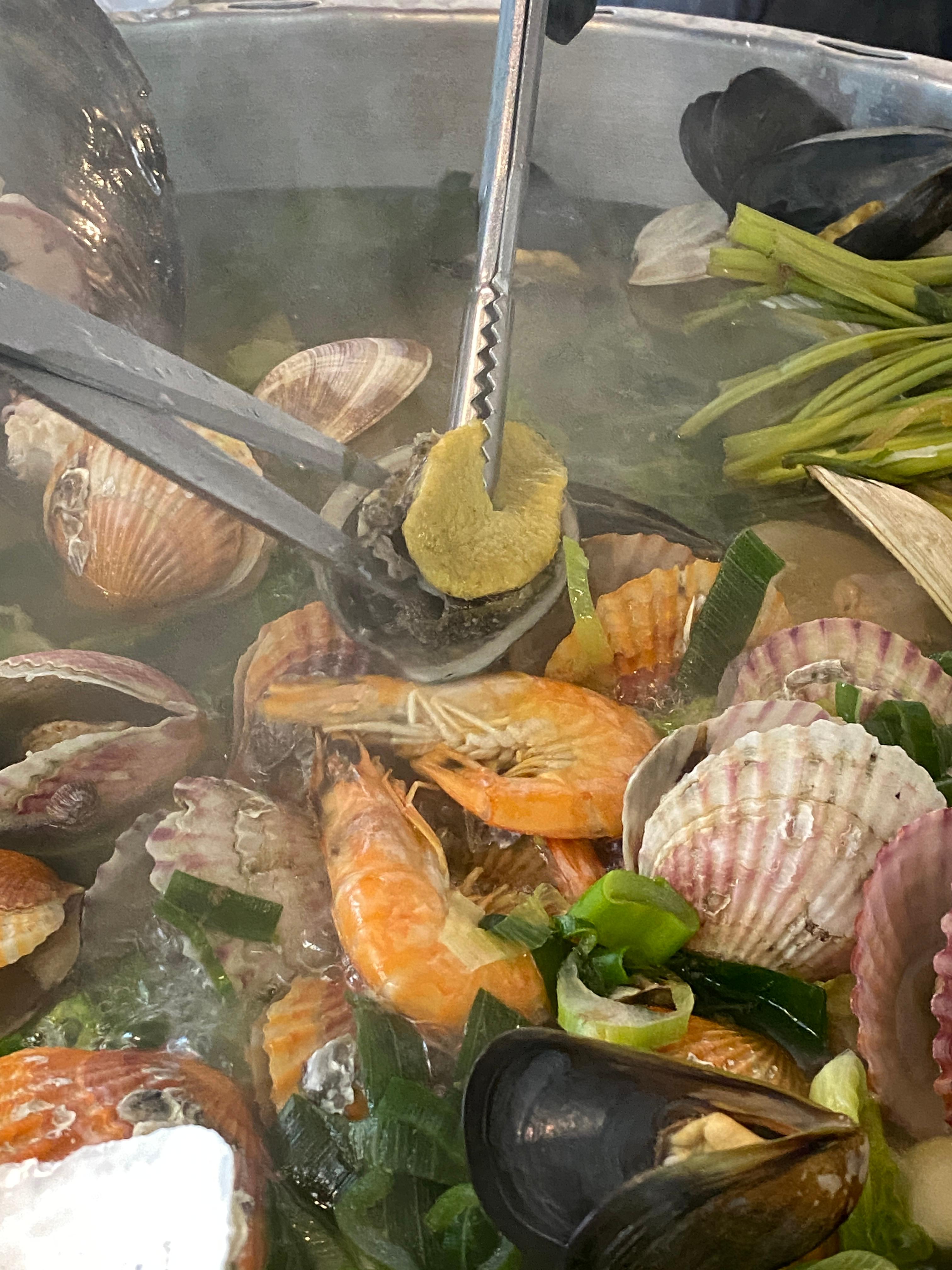 다양한 종류의 조개를 비롯해 굴, 전복, 새우가 들어가 있다. 이 커다란 솥에 바다가 다 들어가 있다.