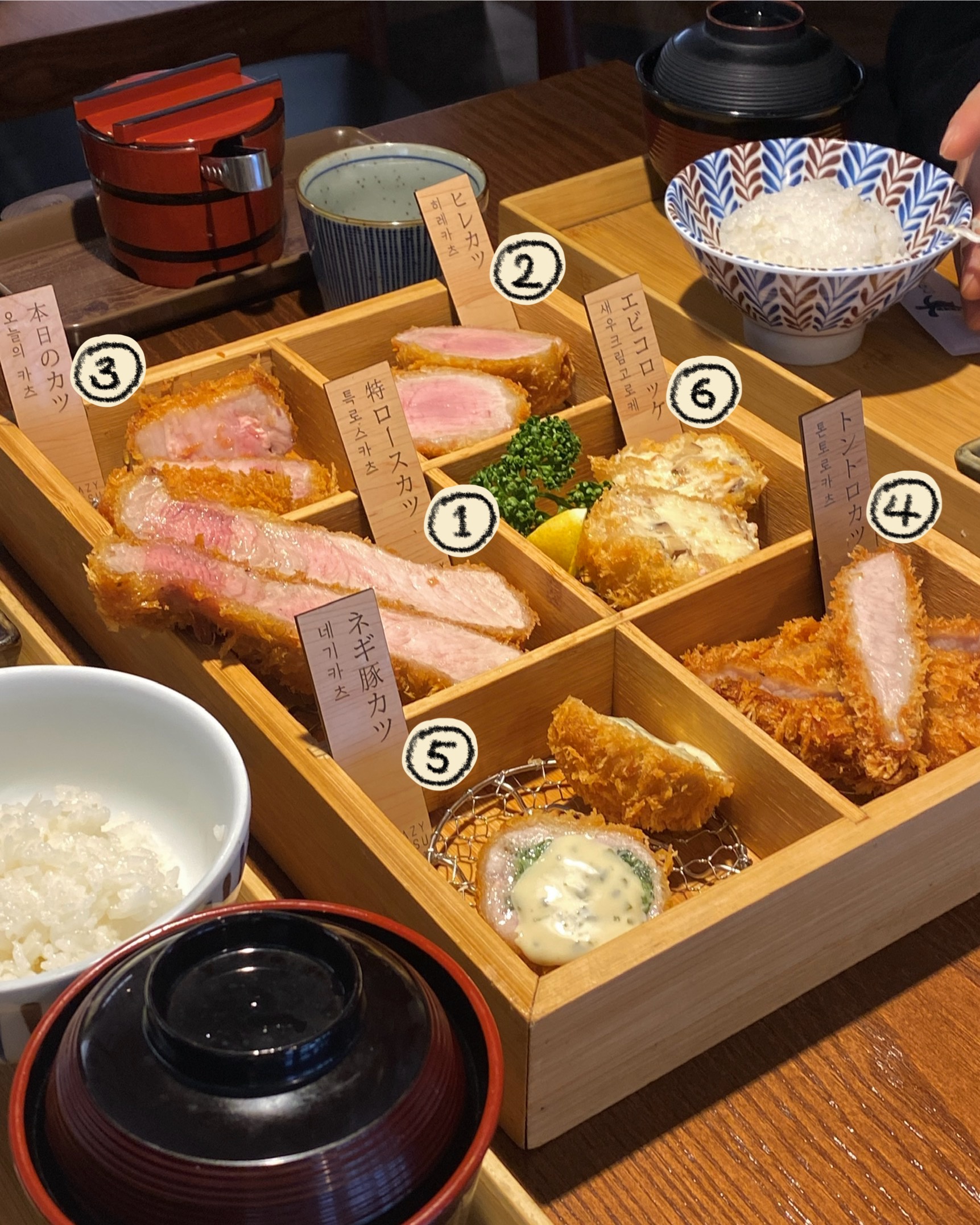 - 메뉴에서 추천하는 순서 : 특로스카츠 > 히레카츠 > 오늘의 카츠 > 톤토로카츠 > 네기로스카츠 > 새우크림고로케