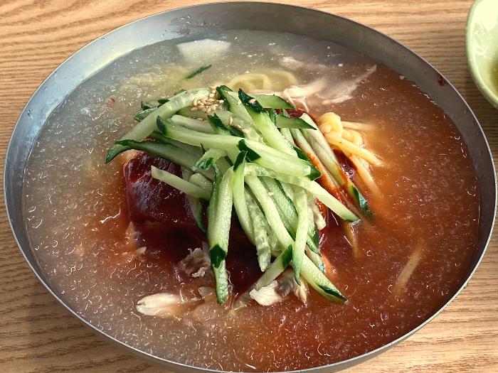 굉장히 투박하게 제공된 냉밀면은 그릇에 담긴 포스부터 맛집의 아우라를 뿜어내고 있었는데 면 위에 올라간 빨간 양념장이 정말 굉장한 치트키였다. 얼큰한 해장국을 먹었을 때의 기분이 느껴지는 차가운 국물은 정말 시원한 국물의 끝을 보여주고 있어 역시나 깐펑기 때 생각났던 맥주나 막거리를 곁들이지 못하는 나의 아쉬움을 더 키웠다.